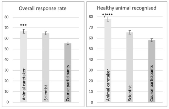 The results of the three different occupational groups were compared with each other, and the animal keepers were significantly better than the course participants in assessing stress in all four questions. They were also significantly better than the scientists at recognising a healthy animal (Figure 2).