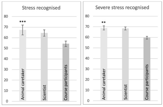 Comparison of the mean values and standard errors for the different groups. Y-axis = mean values agreement with the answer in %. * p-value < 0.05, ** p-value < 0.01, *** p-value < 0.001. The group of animal caretakers was significantly better at the individual questions, especially compared to the course participants (evaluation according to Bonferroni): general response rate p-value < 0.001 compared to course participants, recognition of healthy animals p-value 0.033 compared to scientists and p-value < 0.001 compared to course participants, recognition of stressed animals p-value < 0.001 compared to course participants and recognition of severely stressed animals p-value 0.001 compared to course participants.