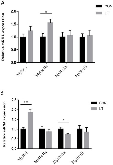The MyHC I, MyHC IIa, MyHC IIb and MyHC IIx mRNA expressions were detected by real-time quantitative PCR. As shown in Figure 1A, LT had no effect (p > 0.05) on LM MyHC I, MyHC IIb and MyHC IIx mRNA levels, but resulted in greater (p < 0.05) MyHC IIa mRNA levels. As shown in Figure 1B, LT had no effect (p > 0.05) on PM MyHC IIa and MyHC IIb mRNA levels, but resulted in greater (p < 0.01) MyHC I mRNA levels and lower (p < 0.05) MyHCIIx mRNA levels.