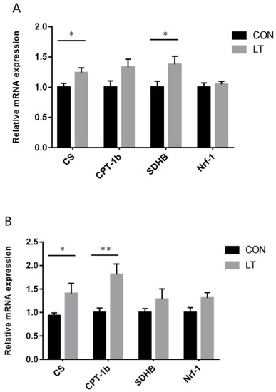 As shown in Figure 2A, compared with the CON group, LT increased (p < 0.05) the mRNA expression of CS and SDHB in LM, but had no effect (p > 0.05) on CPT-1b and Nrf-1 mRNA levels. As shown in Figure 2B, increased CS (p < 0.05) and CPT-1b (p < 0.01) mRNA levels were observed in the LT group in PM, but there were no effects (p > 0.05) on SDHB and Nrf-1 mRNA levels.