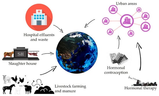 Sources of estrogens present in the environment and their simplified pathways leading to the environment (based on [,,,,]).