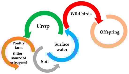 Increasing the level of estrogens in birds reduces fertility, slows down sexual maturity of females, impairs male mating behaviors, and also accumulates in the tissues of an adult individual, as well as in eggs, which can negatively affect the development of embryos (including increasing their mortality) [,]. In addition, in the case of farmed birds, increasing the level of estrogen in the body may have adverse effects on the animal, but also resulted in the hypothesis that the use of their feces in farmland has recently been recognized as the main source of estrogen in the environment []. Poultry feces, causing contamination of surface waters with estrogens [,,], negatively affect the reproductive behavior of wild birds (i.e., the perception of male sounds by females), including the development of their offspring, due to accumulation in the body (Figure 2) [,,,]. The sensitivity of birds to estrogen levels in the environment is, however, strongly correlated with the species and their age, except during development. Too high level of estrogens in the environment can also disturb the behavior of birds, often increasing the risk of aggressive behavior and impair the functioning of the immune system. On the other hand, the increased level of estrogens is also accumulated in the egg and the forming embryo, which may cause, among others: impairment of male reproductive behavior or disruption of sexual differentiation of the nervous systems that controls reproduction, and in worst case death of the embryo [,,,,,,].