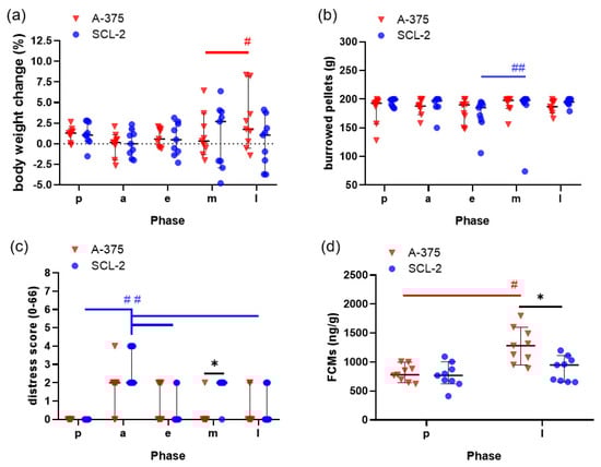 Evaluation of distress during the growth of the A-375 and SCL-2 tumors in mice during pre- (p), acute (a), early (e), middle (m) and late (l) phase. (a) Percentage of body weight change, (b) burrowing activity, (c) distress score and (d) concentration of faecal corticosterone metabolites (FCMs). Graph (a): # p = 0.0366; (b): ## p = 0.0287; (c): * p = 0.0034, ## p ≤ 0.0175; (d): * p = 0.0013, # p < 0.0001; A-375: n = 9, SCL-2: n = 9.