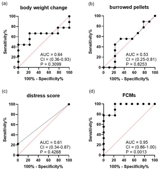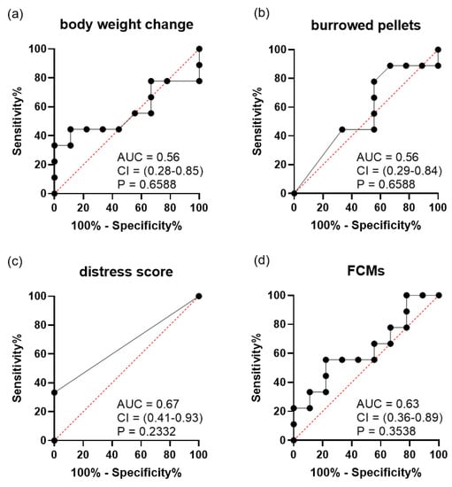 Due to the distinct characteristics of each tumor cell line, the diagnostic ability of each distress parameter was analysed separately. After A-375 cell injection, the diagnostic ability to differentiate between mice with and without tumor was low for body weight change (Figure 3a), burrowing activity (Figure 3b) and distress scores (Figure 3c). However, FCM concentrations (Figure 3d) could differentiate very well between mice with and without tumors. After SCL-2 cell injection, all distress parameters, percentage of body weight change (Figure 4a), burrowing activity (Figure 4b), distress scores (Figure 4c) and FCMs (Figure 4d), could not differentiate between mice with and without a tumor.