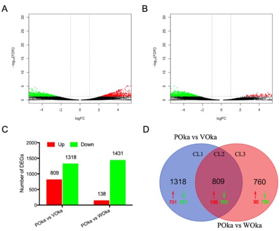 Analysis of the DEGs upon Vp and WSSV challenges. (A) Volcano plot displaying DEGs between the VOka group and the POka group. (B) Volcano plot displaying DEGs between the WOka group and the POka group. The X axis displays the log of the FC (VOka or WOka group relative to POka group) and the Y axis represents the negative log of the FDR (base 10). Black dots represent genes whose expression levels did not reach statistical significance. (C) Statistical results of DEGs between the control group and experimental groups. (D) A two-set Venn diagram showing the number of DEGs in different treatments. Upregulated genes are marked with red and downregulated genes are shown in green.