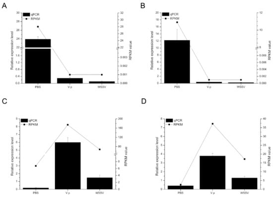 To verify the accuracy of the transcriptome data, four DEGs were randomly selected for qRT-PCR from 809 DEGs located at the intersection of Figure 1D. The expression profiles of them in the transcriptome data were in good agreement with the qPCR results (Figure 2). Unigene0055376 (Figure 2A) and Unigene0018885 (Figure 2B) were significantly downregulated in the lymphoid organ of shrimp under both the Vp and WSSV stimulation, while Unigene0024101 (Figure 2C) and Unigene0028929 (Figure 2D) were obviously upregulated.