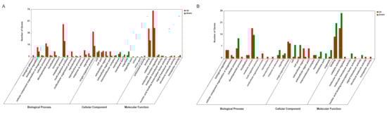 GO term (level 2) distribution for the DEGs from the present transcriptome analysis of lymphoid organ after V. parahaemolyticus (A) and WSSV (B) challenges. The horizontal axis displays the name of GO subcategories. The vertical axis represents the number of genes. Red indicated upregulated DEGs and green showed downregulated DEGs.