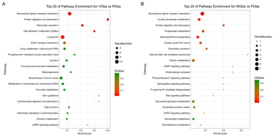 Signaling pathways were defined using the KEGG database (Tables S5 and S6) and the top 20 pathways were shown in Figure 4. Among them, the top five pathways in the lymphoid organ challenged by two pathogens had significant differences (p-value < 0.01 and q-value < 0.05) (Figure 4). Importantly, “neuroactive ligand–receptor interaction” and “protein digestion and absorption” were the significantly enriched pathways in both the VOka and WOka groups (Figure 4) and might play important roles in response to pathogen challenge in the lymphoid organ. “Lysosome” was the significantly enriched pathway only in the VOka group (Figure 4, Table S5) and probably served as an important organelle involved in the clearance of invasive Vibrio. Carbohydrate metabolism related pathways including “inositol phosphate metabolism”, “propanoate metabolism” and “glycolysis/gluconeogenesis” were the significantly enriched pathways only in the WOka group (Figure 4, Table S6). It had been reported that WSSV could induce changes in carbohydrate metabolism in multiple tissues of shrimp including hemocytes, hepatopancreas, and muscle [24,25]. In shrimp hemocytes, WSSV induces the invertebrate Warburg effect (or aerobic glycolysis) in the early infection stage and significantly activates several metabolic pathways, which is essential for successful viral replication [26]. Our results showed that carbohydrate metabolism in shrimp lymphoid organ was very likely to be altered by WSSV infection.