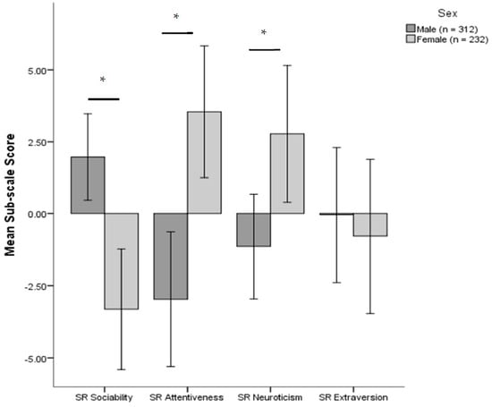 Mean subscale scores for each SR personality dimension, split by sex ± 2 standard errors. * indicates a significant difference between sex at the α = 0.05 level.
