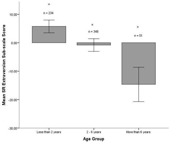 Mean SR Extraversion subscale scores (%) according to age group ± 2 standard errors. * indicates a significant difference at the group p < 0.05 level (Tukey’s HSD).