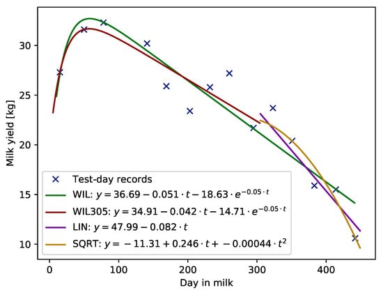 Examples of lactation curves with standard shape for milk yield, fitted with the use of each of the compared models, i.e., WIL function fitted using records from whole lactation, WIL305 fitted using TD records up to 305 DIM, and LIN or SQRT functions fitted to records beyond 305 days in milk are given in Figure 1.