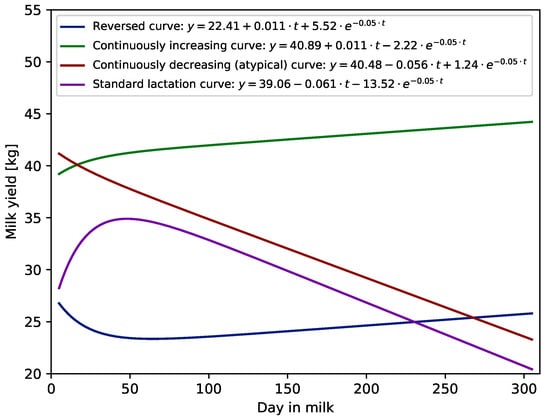 Mathematical modelling has been often used in the analyses of test-day data in dairy cattle [2,3,4,5,6,7,8]. The usefulness of this method depends on how well the functions can mimic the biological process of milk production [3], so selection of the lactation curve model is associated with balancing between the fitting properties and the requirements for biological interpretations [9]. Over the past decades, a variety of models have been proposed to describe the standard lactation curve pattern of milk production. Early studies used parametric functions, such as Wood [10], Wilmink [11] or Ali and Schaeffer [12]. Some of these models, i.e., the Wood and Wilmink functions, have a biological interpretation of parameters [2]. Functions such as Legendre orthogonal polynomials and splines have been proposed as possible alternatives to parametric models describing the lactation course [1,13]. Properties of functions applied to model lactation curves were examined, not only in terms of goodness of fit, but also for indicating peak milk yield and a day of peak milk yield as well as for estimating 305-day cumulative milk yields [14,15]. The existence of lactation curves with shapes markedly different from the standard was usually neglected or considered as biologically atypical [2]. In practice, lactation curves may vary in shape. One option is a reversed shape, typical for fat and protein contents in milk, with an initial decreasing phase to a minimum, followed by an increase until the end of lactation. Other options are continuously increasing or continuously decreasing curves with no lactation peak or curves characterized by the occurrence of an additional peak later in the course of lactation. The latter shape may be associated with seasonal effects and may characterize the cows calving in autumn in pasture-based farming systems [1]. The occurrence of different shapes of lactation curves for milk yield of dairy cows has been examined by Macciotta et al. (2005) and Otwinowska-Mindur and Ptak (2016) [2,16]. The former found that the three-parameter models, i.e., Wood and Wilmink functions, were able to detect two main groups of curve shape: standard and atypical. The latter confirmed that those two types of lactation curves (standard and atypical) could be successfully modelled by the Wilmink function.