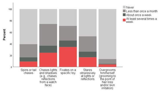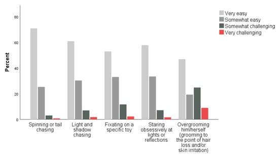 When asked to indicate how frequently their cat engaged in several behaviors that have been identified as potential indicators of FCD (including: spins or tail chases, chases lights and/or shadows, fixates on a specific toy, stares obsessively at lights or reflections, and overgrooming), the behaviors reported most frequently include fixating on a specific toy and chasing lights and/or shadows (Figure 1). When asked, for each behavior reported, how easy it was to redirect their cat when the cat is performing the behavior, the behaviors reported as easiest to redirect were spinning/tail chasing and light and/or shadow chasing (Figure 2).