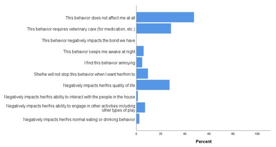 In addition, respondents were asked to indicate the impact of each of these behaviors on their, or their cats’, lives. For those who reported spinning/tail chasing (n = 243), most guardians indicated that the behavior did not affect them at all (96.3%). A small percentage reported the behavior kept them awake at night (1.2%) or negatively impacted their cat’s quality of life (1.2%). The remaining effects (e.g., negatively impacts the guardian’s bond with their cat; requires medication; etc.) were reported by less than 1% of the respondents. Similarly, when asked about chasing lights or shadows (n = 459), 97.4% reported that the behavior did not affect them at all, and only 1.3% found the behavior annoying. The remaining effects were reported by less than 1% of the respondents. When asked about their cat fixating on a specific toy, 94.5% indicated the behavior did not affect them, similar to reports regarding staring at lights or reflections (n = 327, 95.4%). However, for overgrooming (n = 84), only 47.6% of guardians reported that the behavior did not affect them (Figure 3). Even so, no guardians reported that overgrooming negatively impacted the bond with their cat.