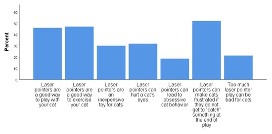 Interestingly, the statement “Laser pointers can make cats frustrated if they do not get to ‘catch’ something at the end of play” was the statement reported as familiar to the greatest proportion of respondents (52.1%); yet only 35.6% of respondents reported following this advice. This was followed closely, however, by the statement “Laser pointers are a good way to exercise your cat” (47.1%), perhaps reflecting the current emphasis on providing both physical and mental exercise for companion cats, and partially explaining their use by a significant proportion of cat guardians. Only about one in five cat guardians reported familiarity with the statements “Laser pointers can lead to obsessive behavior” (18.6%) and “Too much laser pointer play can be bad for cats” (21.4%).
