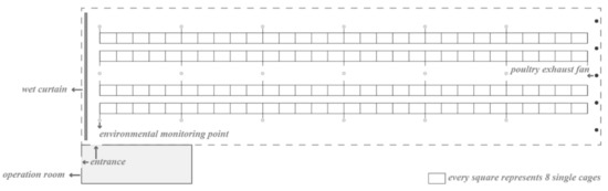 In the henhouse, there were four rows with six test sites each, and five groups of 40 hens were housed between two test sites (1.2-m above the ground). The east side of the henhouse was equipped with five exhaust fans and provided with negative-pressure ventilation (Figure 1).