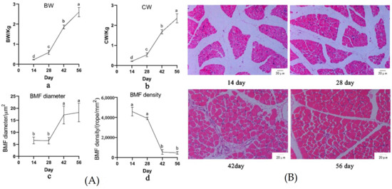 (A) Body weight (BW, a), carcass weight (CW, b), breast muscle fiber (BMF) diameter (c), and BMF density (d); (B) Hematoxylin-eosin (HE) section of breast muscle at different stages.