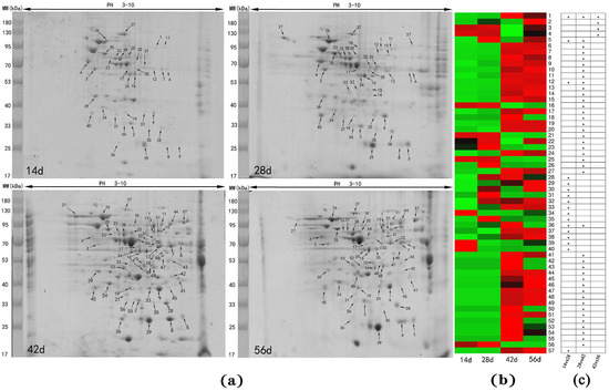 (a) Two-DE profiles of liver in Muscovy duck, day (d); (b) The relative expression of differentially abundant proteins at different stages, the gradient from green to red represents a gradual increase in protein expression; (c) The p-values of spots at 14 vs. 28, 28 vs. 42 and 42 vs. 56, p < 0.05 = *.