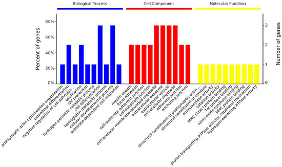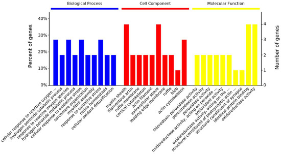 The 17 differentially abundant protein spots were identified as 13 proteins at the 14 vs. 28 day stage (Table 3). They were significantly enriched in 43 biological processes, 29 cellular components, and 17 molecular functions (Figure 3). In biological processes, Peroxiredoxin 3 (PRDX3), Peroxiredoxin 1 (PRDX1), and TPI1 are enriched in the cellular response to oxidative stress (GO: 0034614). ACTG1 and Tropomyosin 4 (TPM4) are enriched in sarcomere organization (GO: 0045214) and myofibril assembly (GO: 0030239). In cellular components, proteins are mostly enriched in the myelin sheath (36%) and intracellular organelle (18%). In molecular functions, proteins are mostly enriched in protein binding (27%), oxidoreductase activity (18%), and thioredoxin peroxidase activity (18%, Supplementary Table S1).