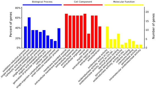 The 41 differentially abundant protein spots were identified as 39 proteins at the 28 vs. 42 day stage (Table 3). They were significantly enriched in 148 biological processes, 31 cellular components, and 64 molecular functions (Figure 4). In biological processes, 12 proteins are enriched in the oxidation-reduction process (GO: 0055114), 10 proteins are enriched in the carboxylic acid metabolic process (GO: 0019752), 10 proteins are enriched in oxoacid metabolic process (GO: 0043436), and 17 proteins are enriched in the single-organism catabolic process (GO: 0044712). In cellular components, proteins are mostly enriched in membrane-bounded vesicle (68%) and organelle (18%). In molecular functions, proteins are mostly enriched in oxidoreductase activity (43%) and catalytic activity (14%, Supplementary Table S2).