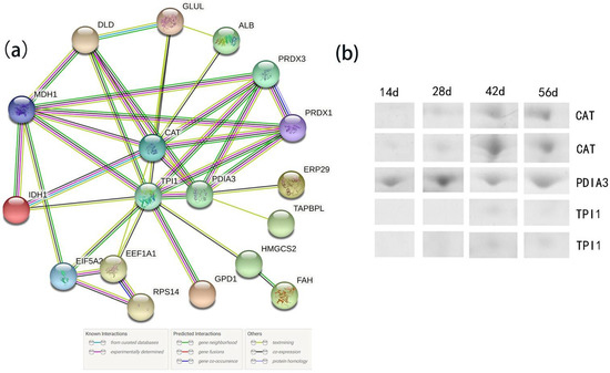 (a) The biological interaction network of the proteins for all differentially expressed proteins; (b) The expression level of node proteins in 2D electrophoresis gels, day (d). Note: CAT, catalase; TPI1, triosephosphate isomerase; PDIA3, protein disulfide-isomerase; ERP29, endoplasmic reticulum protein 29; TAPBPL, glyceraldehyde-3-phosphate dehydrogenase; HMGCS2, 3-hydroxy-3-methylglutaryl coenzyme A synthase; FAH, fumarylacetoacetase; GPD1, glycerol-3-phosphate dehydrogenase; EEF1A1, elongation factor 1-alpha; RPS14, ribosomal protein S14; EIF5A2, eukaryotic translation initiation factor 5A; IDH1, isocitrate dehydrogenase; MDH1, malate dehydrogenase; DLD, dihydrolipoyl dehydrogenase; GLUL, glutamine synthetase; ALB, albumin; PRDX3, Peroxiredoxin 3; PRDX1, Peroxiredoxin 1.