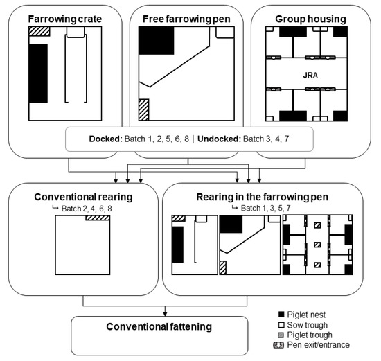 The study was conducted on the experimental farm for pigs of the Chamber of Agriculture for Lower Saxony in Wehnen, Germany. In eight batches between December 2016 and January 2018, in total 1106 crossbred (Piétrain × [Landrace × Large White]) pigs were included in a 3 × 2 × 2 factorial design study from three different farrowing systems: (1) conventional single-housing in farrowing crates (FC; n = 349), (2) single-housing in free farrowing pens (FF; n = 340), and (3) group housing of lactating sows (GH; n = 417) (Figure 1).