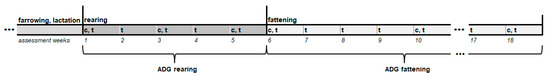 Timeline for the assessed and analyzed parameters over the 18 assessment weeks (c: complete assessment of skin lesions, ear lesions and losses, lameness and manure on the body; t: assessment of tail lesions and losses; ADG: calculated average daily gain).