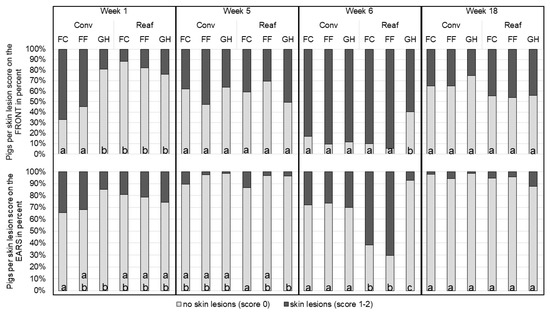 In week 5, at the end of the rearing period, no significant differences between the groups could be detected on the front and the middle (p > 0.05) but, on the ears, less Reaf-GH pigs had lesions than Reaf-FC pigs (p = 0.048). In week 6, all groups showed the highest occurrence of skin lesions on the front body. Conv Pigs did not significantly differ in the number of skin lesions (p = 1.0). On the front and the ears, significantly less Reaf-GH pigs had skin lesions than the other experimental groups (p < 0.03). Reaf-FC and Reaf-FF did not differ from the Conv pigs concerning skin lesions on the front body (p = 1.0). On the middle body part, significantly less GH and FC pigs had skin lesions than FF pigs in week 6 (FC = 65.9%a; FF = 82.1%b; GH = 50.1%a; p < 0.02). In week 18, at the end of fattening period, no significant effect of the housing systems could be found (p > 0.69) (pigs with skin lesions on middle body part: FC = 12.3%; FF = 7.7%; GH = 11.5%).