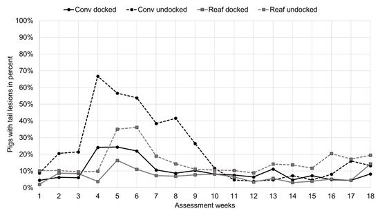 The model for the prevalence of tail lesions included the fixed effects rearing system (Conv, Reaf), docking status (docked, undocked), assessment week (1–18) and the interaction of rearing system × docking status × assessment week. Batch and animal identities were added as random effects.