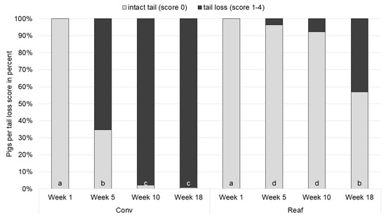 Frequency in percent of back transformed tail loss estimates of the interaction of rearing system × assessment week of undocked pigs (Conv: conventional rearing; Reaf: rearing in the farrowing pen; a–d: different letters indicate significant differences of score 0 (no losses) across housing system and assessment week (p < 0.05).