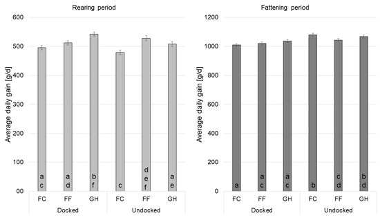 Estimated average daily gain in gram per day for the interaction of docking status × farrowing system (FC: farrowing crate; FF: free farrowing pen; GH: group housing of lactating sows; a–f: different letters indicate significant differences within the rearing or fattening period (p < 0.05)).