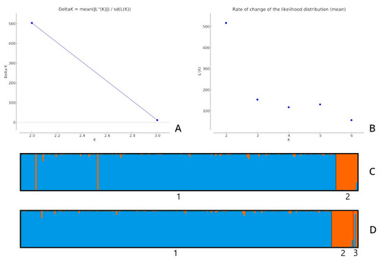 - Pritchard, J.K.; Stephens, M.; Donnelly, P. Inference of population structure using multilocus genotype data. Genetics 2000, 155, 945–959. [Google Scholar] [CrossRef]