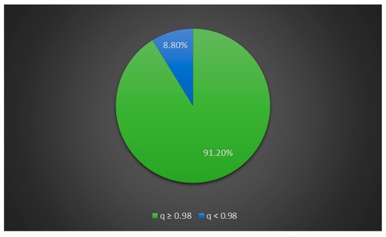 Percentage of pure-bred alpacas (q ≥ 0.98) and alpaca × llama hybrids (q < 0.98) across all tested alpacas.