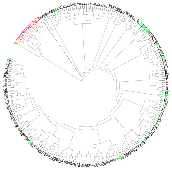 Dendrogram of genetic distance between all individuals by UPGMA algorithm. Black color—alpacas with q ≥ 0.98; red color—llamas with q ≥ 0.98; blue color—three putative hybrids; green color—alpacas with q < 0.98; yellow color—llama with q < 0.98.