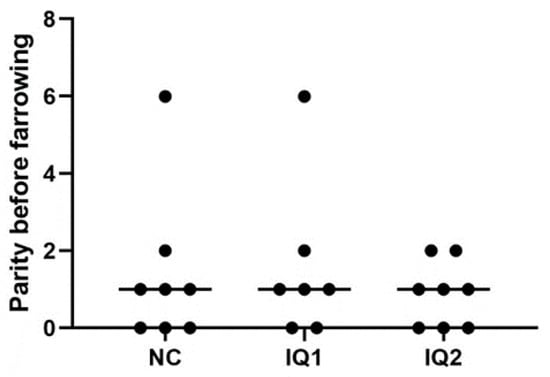 Parity of sows, before the farrowing, included in the experiment. Sows received either a basal diet (NC), or supplementation with isoquinoline alkaloids (IQ) during gestation and lactation (IQ1), or only during the lactation period (IQ2).