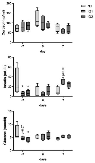 Cortisol, insulin and glucose levels in sows’ plasma one week before farrowing (−7 d), on the farrowing day (0 d), and one week after farrowing (7 d). Sows received either a basal diet (NC), or supplementation with isoquinoline alkaloids (IQ) during gestation and lactation (IQ1), or only during the lactation period (IQ2). Data presented in boxplot: box line + median, mean ± bars (inner fences defined by Tukey’s method). Statistical differences were considered when p < 0.05, as indicated by asterisks (*, p < 0.05); statistical trends were considered when 0.1 > p > 0.05.
