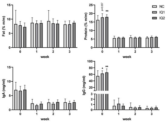 Fat and protein (%, top graphs), immunoglobulin A and immunoglobulin G (mg/mL; lower graphs) content in colostrum and milk. Sows received either a basal diet (NC), or supplementation with isoquinoline alkaloids (IQ) during gestation (90 ppm) and lactation (150 ppm) (IQ1), or only during the lactation period (IQ2). Milk collection was performed once a week from farrowing (week 0) until day 21 of lactation (3rd week). Data presented as mean ± SD. Statistical differences were considered when p < 0.05, as indicated with * (*, p < 0.05; **, p < 0.01), statistical trends were considered when 0.1 > p > 0.05.