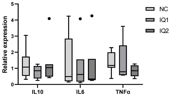 Relative gene expression in ileal tissue of piglets 5 days after weaning on day 21, born from sows that received either a basal diet (NC), or supplementation with isoquinoline alkaloids (IQ) during gestation (90 ppm) and lactation (150 ppm) (IQ1), or only during the lactation period (IQ2). ACTB and GADPH were used as reference genes. A standard dilution curve was used to calculate the relative gene expression of the target genes, using the geometric average of the housekeeping genes (n = 7/group). Data presented in boxplot: box line + median, mean ± bars (inner fences) and Tukey’s outliers (circles). Statistical differences were considered when p < 0.05.