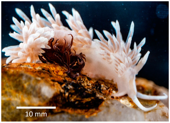 The aeolid nudibranch Berghia stephanieae (Figure 1) is one such sea slugs that can retain photosynthetic dinoflagellate endosymbionts from its dietary prey. This nudibranch was first described as Aeolidiella stephanieae by Valdés [13]. In 2013, the species was assigned to genus Berghia by Carmona et al. [14], supported by molecular phylogenetic evidence using COI and 16S mitochondrial and H3 nuclear markers. Being a stenophagous species, as are several other nudibranchs, B. stephanieae feeds exclusively on glass anemones, such as Exaiptasia diaphana (Rapp, 1829) (Cnidaria: Actiniaria), which commonly host photosynthetic dinoflagellate endosymbionts [15]. This specialized feeding behavior has made this nudibranch species highly popular in the marine aquarium trade where it is erroneously traded as Berghia verrucicornis and fetches high retail values [16]. Indeed, this sea slug is popular amidst marine aquarium keepers for its ability to control glass anemone outbreaks in reef aquariums that may damage precious hard corals and other marine invertebrates commonly displayed [9,13]. This sea slug is also considered a suitable model organism for laboratory research, due to its hardiness, regular oviposition, short embryonic and larval period, short generation time and food availability [9], features that also make their captive production appealing for those farming marine ornamental species [17]. Furthermore, the ability of B. stephanieae to retain Symbiodiniaceae dinoflagellates from its prey makes this nudibranch one of the best models for ecological studies addressing mollusk–dinoflagellate endosymbiosis [8,9,18,19].