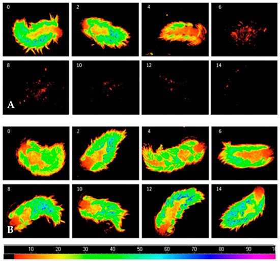 Evolution of the fluorescence parameter Fo monitored using an Imaging-PAM fluorometer in Berghia stephanieae enduring starvation (A) or being fed with symbiotic anemones (Exaiptasia diaphana) for 14 days (B). Numbers in the top left corner of each image refer to the number of days under each feeding treatment.