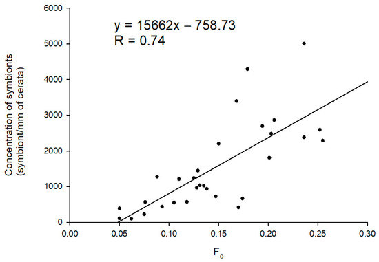 The linear regression modeled to predict the concentration of photosynthetic dinoflagellate endosymbionts in the cerata of sea slugs using Fo as a proxy revealed that these two variables are significantly and positively correlated (F (1, 28) = 33.899, p < 0.001, R = 0.740) (Figure 3). The concentration of photosynthetic dinoflagellate endosymbionts can be predicted using the following equation: