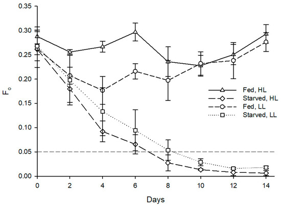 Evolution of fluorescence parameter Fo in photosynthetic dinoflagellate endosymbionts hosted by Berghia stephanieae reared under different light intensities and diets (mean ± std. error, starting n = 5). HL—high light (80 μmol photon m−2 s−1), LL—low light (10 μmol photon m−2 s−1). The dashed line indicates the threshold of Fo corresponding to the absence of endosymbionts detectable in sea slugs’ cerata using microscopy.