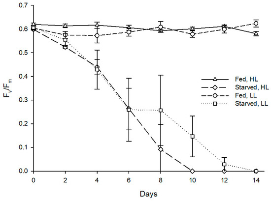 Evolution of fluorescence parameter Fv/Fm in photosynthetic dinoflagellate endosymbionts hosted by Berghia stephanieae reared under different light intensities and diets (mean ± std. error, starting n = 5). HL—high light (80 μmol photon m−2 s−1), LL—low light (10 μmol photon m−2 s−1).