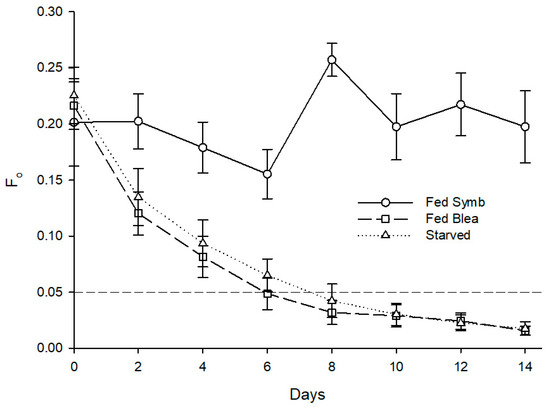 Evolution of fluorescence parameter Fo in photosynthetic dinoflagellate endosymbionts hosted by Berghia stephanieae reared under different diets (mean ± std. error, starting n = 10). Fed Symb—fed with symbiotic anemones (Exaiptasia diaphana), Fed Blea—fed with bleached anemones. The dashed line indicates the threshold of Fo corresponding to the absence of endosymbionts detectable in sea slugs’ cerata using microscopy.