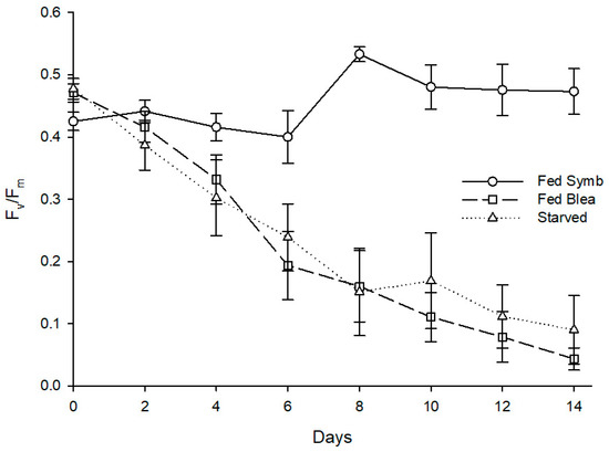 Evolution of fluorescence parameter Fv/Fm in photosynthetic dinoflagellate endosymbionts hosted by Berghia stephanieae when exposed to different diets (mean ± std. error, starting n = 10). Fed Symb—fed with symbiotic anemones (Exaiptasia diaphana), Fed Blea—fed with bleached anemones.
