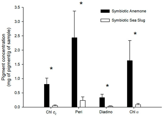 Concentration of photosynthetic pigments (mean ± std. error, n = 5) recorded in symbiotic anemones Exaiptasia diaphana and sea slugs Berghia stephanieae fed with symbiotic anemones (Exaiptasia diaphana). Chl c2—chlorophyll c2, Peri—peridinin, Diadino—diadinoxanthin, Chl a—chlorophyll a. An asterisk above a pigment indicates significant differences (p < 0.05).