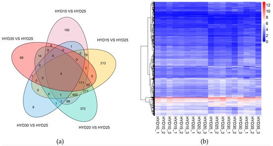 (a) The global overview of differentially expressed genes based on a Venn diagram. (b) Clustering heat map of differentially expressed genes. The horizontal axis represents the log2 (FPKM + 1) of the sample, and the vertical axis represents the gene. The redder the color is, the higher the expression, and the bluer the color is, the lower the expression.