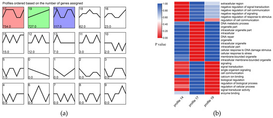 To explore the expression pattern of the DEGs in the process of salinity fluctuation, we conducted tendency analysis based on the expression quantity data of all DEGs. The results showed that all DEGs under salinity fluctuation were mainly divided into three expression trends (Profiles 14, 17, and 19). In addition, we performed GO enrichment analysis to understand the main functions of the genes in the three trends (Figure 2).