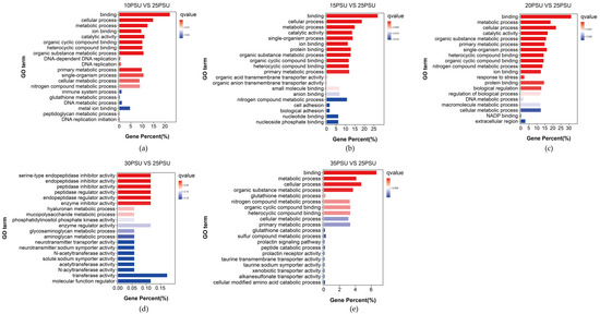 The results of the GO enrichment analysis of the DEGs in the yellow drum under salinity fluctuations. (a) 10PSU vs. 25PSU; (b) 15PSU vs. 25PSU; (c) 20PSU vs. 25PSU; (d) 30PSU vs. 25PSU; (e) 35PSU vs. 25PSU.