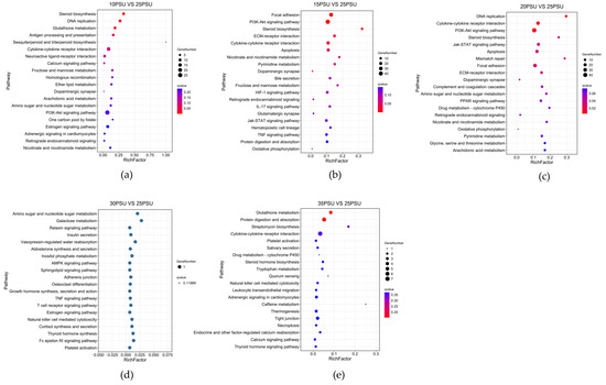 The results of the KEGG pathway enrichment analysis of DEGs in the yellow drum under salinity fluctuations. (The size of the bubble indicates the number of genes enriched to a KEGG pathway, the color represents the Q-value, and the redder the color is, the smaller the Q-value). (a) 10PSU vs. 25PSU; (b) 15PSU vs. 25PSU; (c) 20PSU vs. 25PSU; (d) 30PSU vs. 25PSU; (e) 35PSU vs. 25PSU.